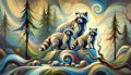 Captivating Canine Kin: A Gray Wolf Family Amidst Surreal Swirls