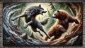 Dynamic Encounter: Gray Wolf and Black Bear in Ferocious Combat
