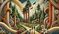 "Cubist Influences in Nature: Majestic Redwoods and Soaring Birds"
